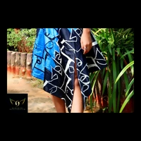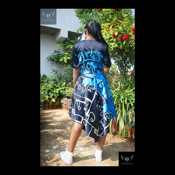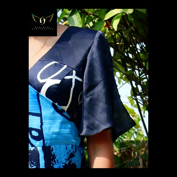 Size- S(chest 34"-36") - alterable till chest 38". Fabric- Heavy crepe. Neckline- V neck overlap with hook & eye closure. Silhouette- classy high low triangular bottom with slit at front and back zipper opening. Sleeves- slit flare. Color- blue-black-white. Pattern- digital abstract grafitti. Length- calf-legth. Fitting- fit & flare.