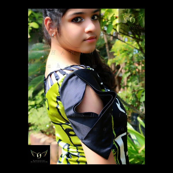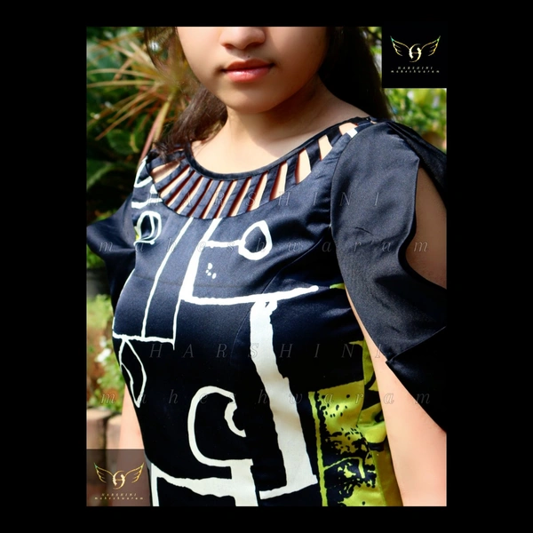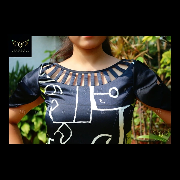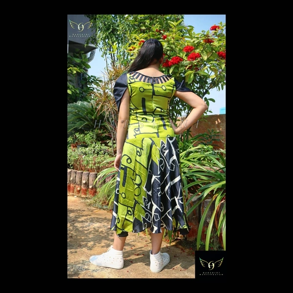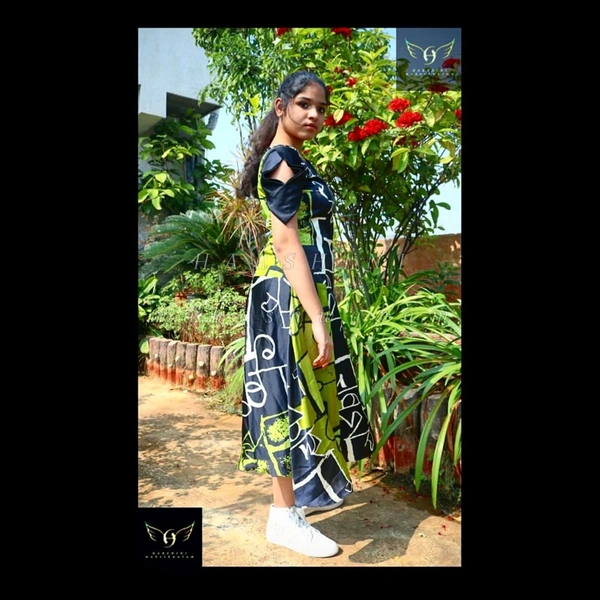 Size- S(chest 34"-36")-(alterable till 38"). Fabric- heavy crepe. Pattern - digital abstract grafitti. Color- green, black, white. Neckline- scoop neck with design. Silhouette- long A cut fit and flare with overlapped cold shoulder sleeves, cut out neck design, along with back zipper closure. Sleeves- overlapped cold shoulder. Fitting- A cut fit and flare. Length- calf length.