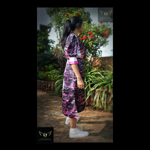 Size- S( chest 34"-36") - alterable till chest 39". Fabric- Heavy crepe. Neckline- asymmetric. Silhouette- asymmetric knee length dress having blouson top fit with left 3"strap and right 3/4th sleeves with cuffs and bottom left having satin flare. Sleeves- 3/4th with cuffs on right. Color- black, pink, white. Pattern- digital brush stroke. Length- knee length. Fitting- fit & flare.