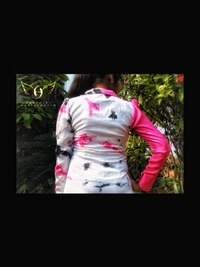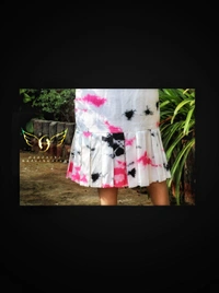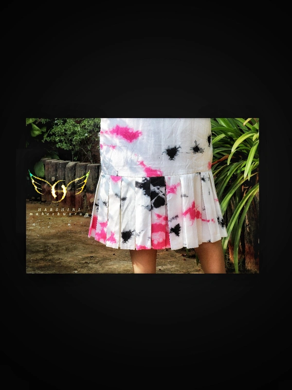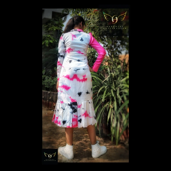 Size- S(chest 34"-36") - alterable till chest 38"-39". Fabric- Heavy crepe. Neckline- V collar neck with hook & eye closure. Silhouette- formal fitted dress with collar, full sleeves and high low pleated hem. Sleeves- full with cuffs. Color- pink, white, black. Pattern- digital abstract tie n dye. Length- calf-length. Fitting- fit & flare.