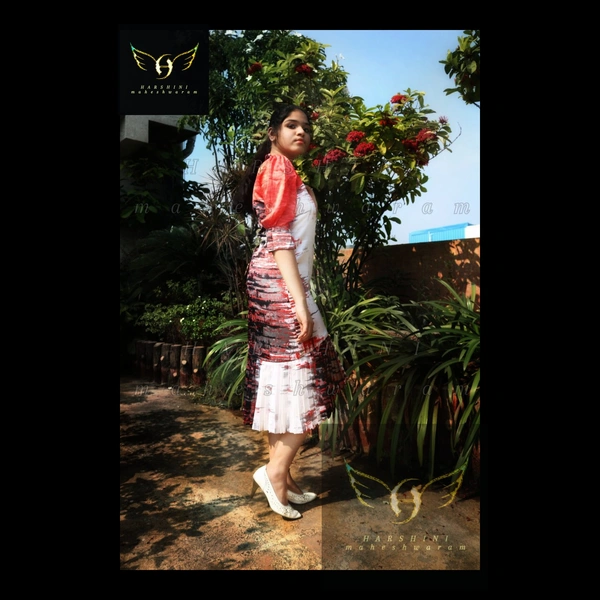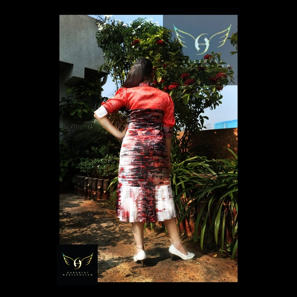 Size- S(chest 34"-36") - alterable till chest 38"-39". Fabric- Heavy crepe. Neckline- V collar neck with hook & eye closure. Silhouette- formal fitted dress with collar, elbow sleeves and high-low knife-pleated hem. Sleeves- elbow length puff sleeves with slit open cuffs with show buttons and no closure. Color- red, white, black. Pattern- digital abstract brush stroke. Length- calf-length. Fitting- sheath fit n flare.
