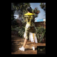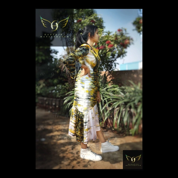 Size- S(chest 34"-36") - alterable till chest 38"-39". Fabric- Heavy crepe. Neckline- V collar neck with hook & eye closure. Silhouette- formal look cape-collar neck with front neck hook-eye closure, with gathered high-low flared bottom hem. Sleeves- bell bottom full flare. Color- yellow, white, black. Pattern- digital abstract brush stroke. Length- calf-length. Fitting- fit & flare.