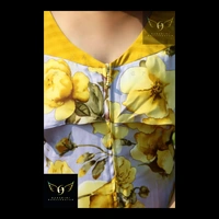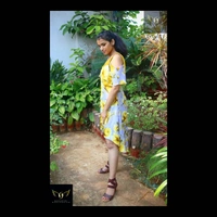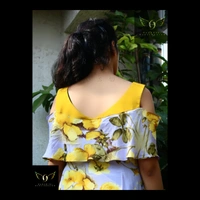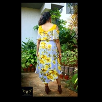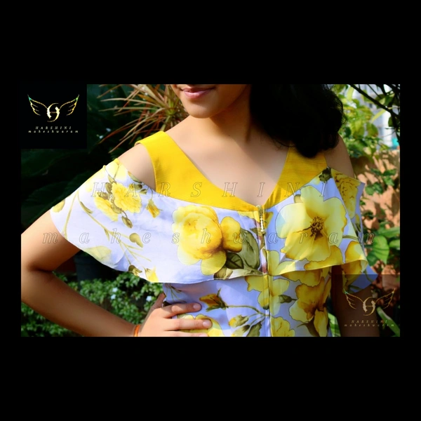 Size- S(chest 34"-36") - alterable till chest 38". Fabric- crepe. Neckline- V neck with metal zipper front closure. Silhouette- A cut high low bottom. Sleeves- flared cold shoulder. Color- yellow-grey. Pattern- digital floral print. Length- knee length. Fitting- A cut.